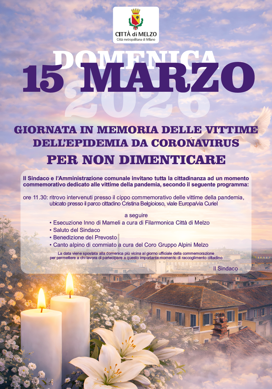 Il Sindaco e l’Amministrazione comunale invitano tutta la cittadinanza ad un momento commemorativo dedicato alle vittime della pandemia, secondo il seguente programma: