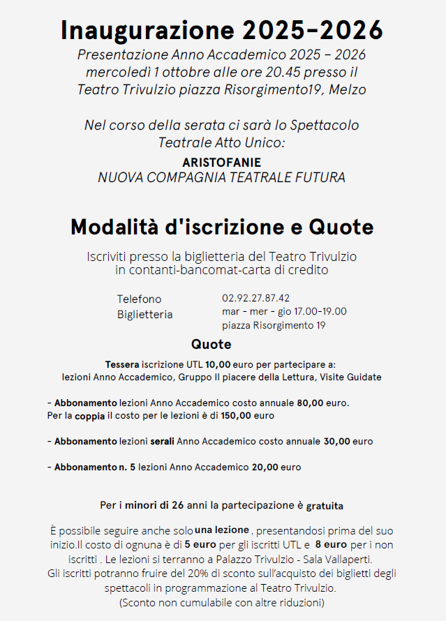 Per info scrivere a utl@teatrotrivulzio.it oppure consultare negli allegati le info dettagliate e il programma completo dell'anno 25/26