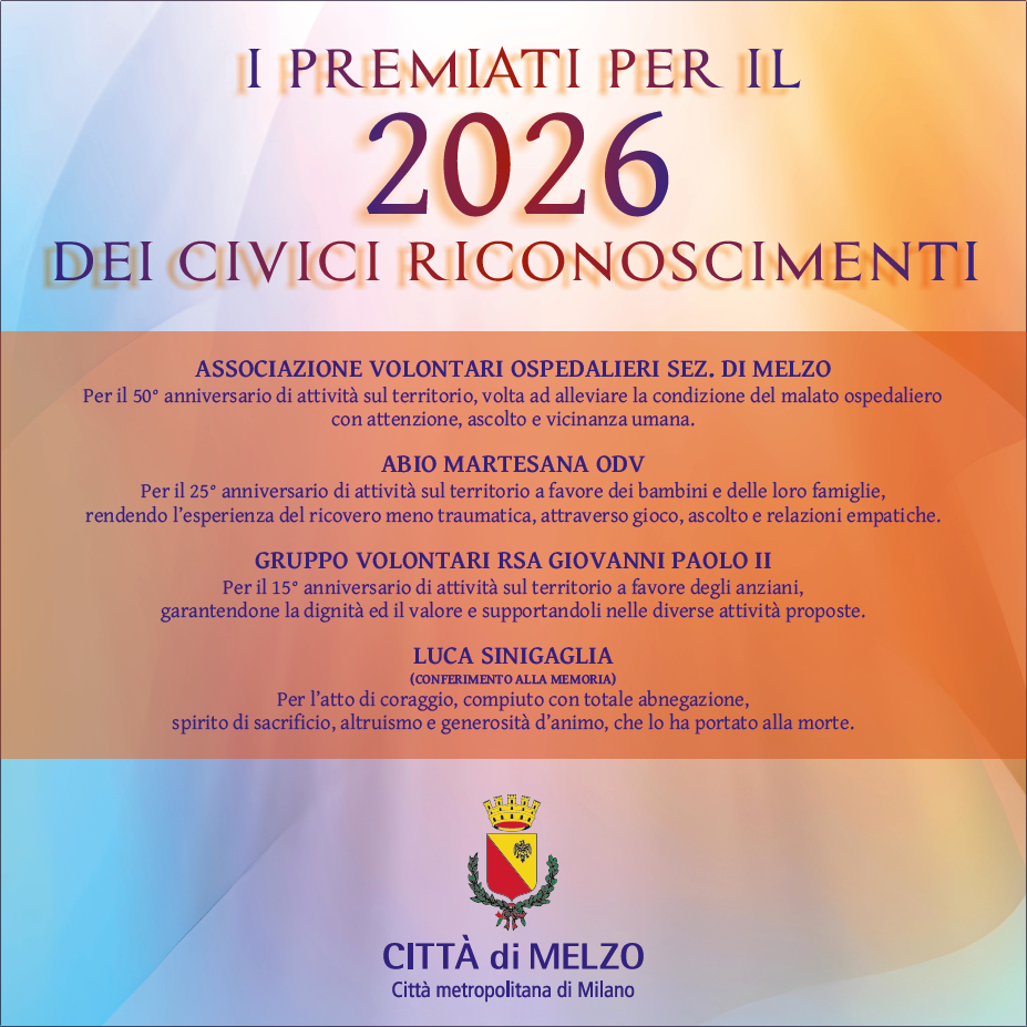 Si rinnova l’appuntamento con l’eccellenza melzese. La Giunta Comunale, con la deliberazione G.C. n.17 del 19.02.2026, ha ufficializzato i nomi dei cittadini e delle realtà che riceveranno le Civiche Onorificenze per la 21^ Edizione del Premio Città di Melzo.